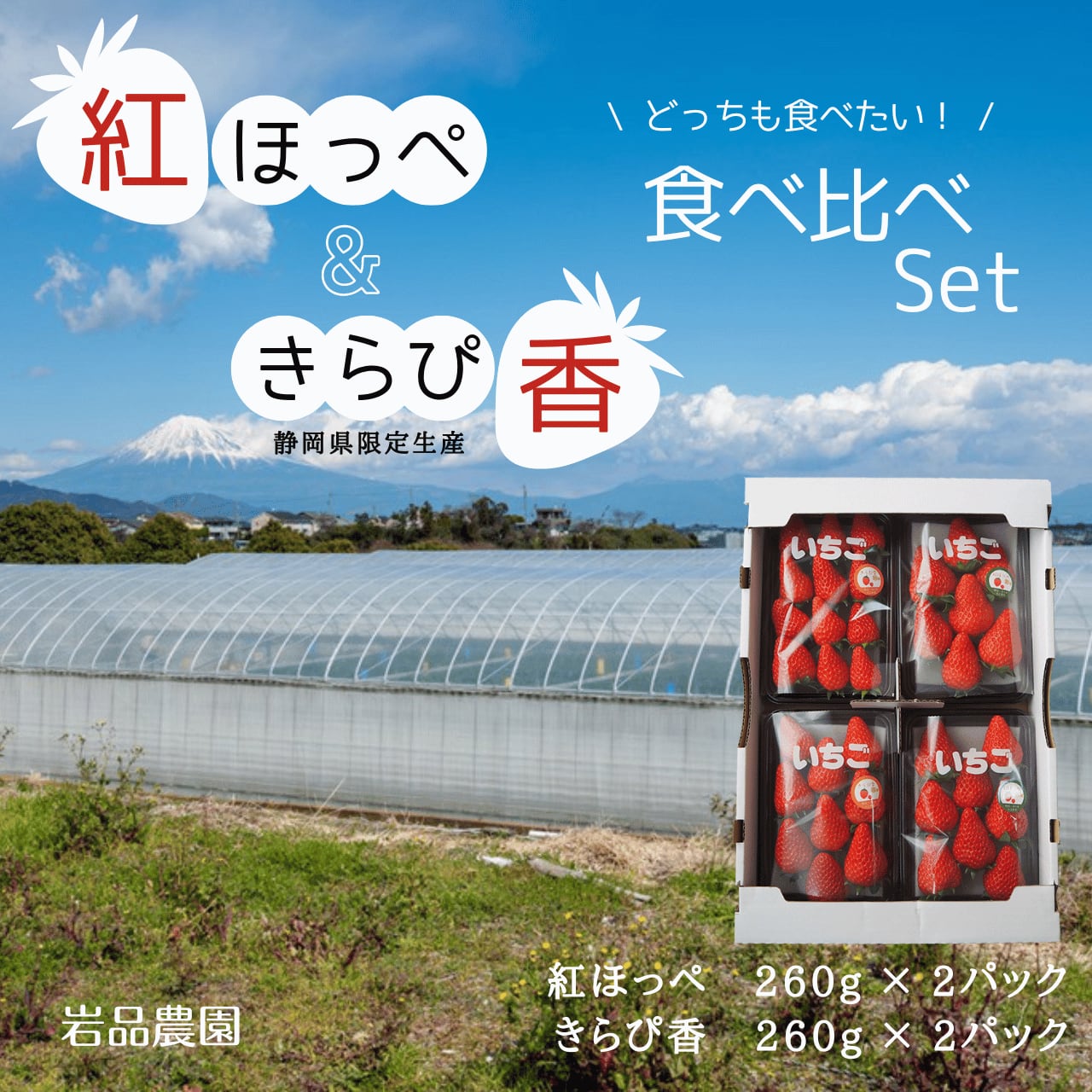静岡県の代表的な品種です。岩品農園の紅ほっぺは甘さが際立ち、いちご本来の酸味も感じられる何個食べても食べ飽きないいちごです。スイーツとの組み合わせも抜群です。